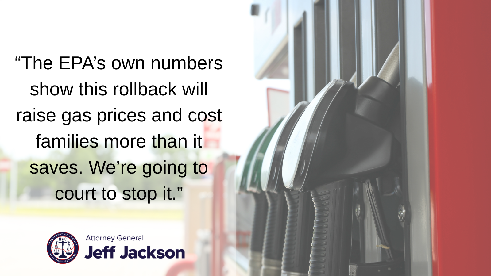 “The EPA’s own numbers show this rollback will raise gas prices and cost families more than it saves. We’re going to court to stop it,” said Attorney General Jeff Jackson.