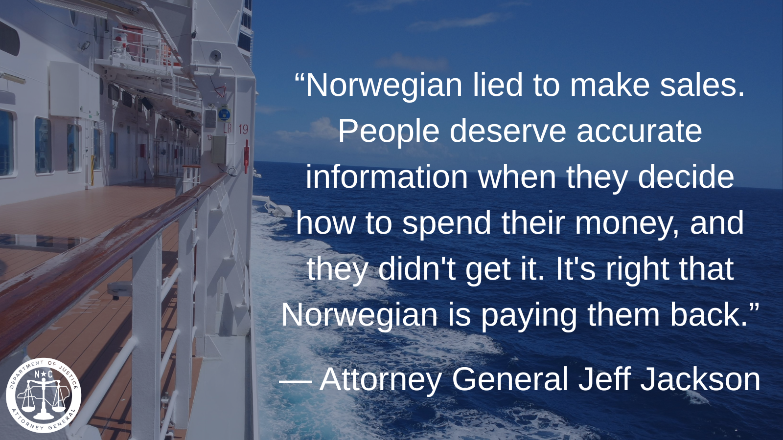 RALEIGH – Attorney General Jeff Jackson today reached a settlement with Norwegian Cruise Line following an investigation into the company’s sales tactics and cancellation procedures at the start of the COVID-19 pandemic.