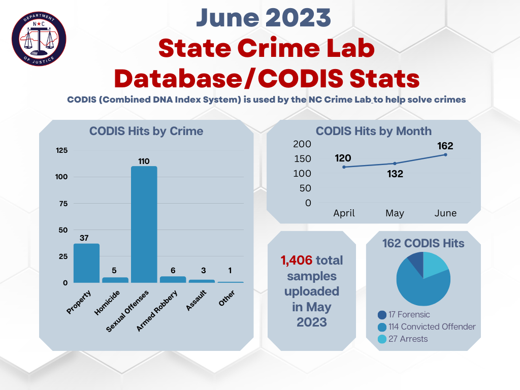 (RALEIGH) Attorney General Josh Stein today shared an update on the North Carolina State Crime Lab’s work to analyze evidence and upload DNA to CODIS, the system of local, state, and national criminal justice DNA databases. In June 2023, the Crime Lab uploaded 1,406 samples to the CODIS database, including samples from people who were arrested, people convicted of offenses that require DNA collection, and evidence called through forensic casework.