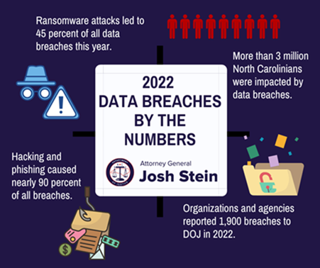 (RALEIGH) Ahead of Data Privacy Day on Saturday, Jan. 28, Attorney General Josh Stein today released the Department of Justice’s 2022 data breach report. The report shares information about the 1,900 data breaches reported to DOJ last year, which affected more than 3 million North Carolinians.