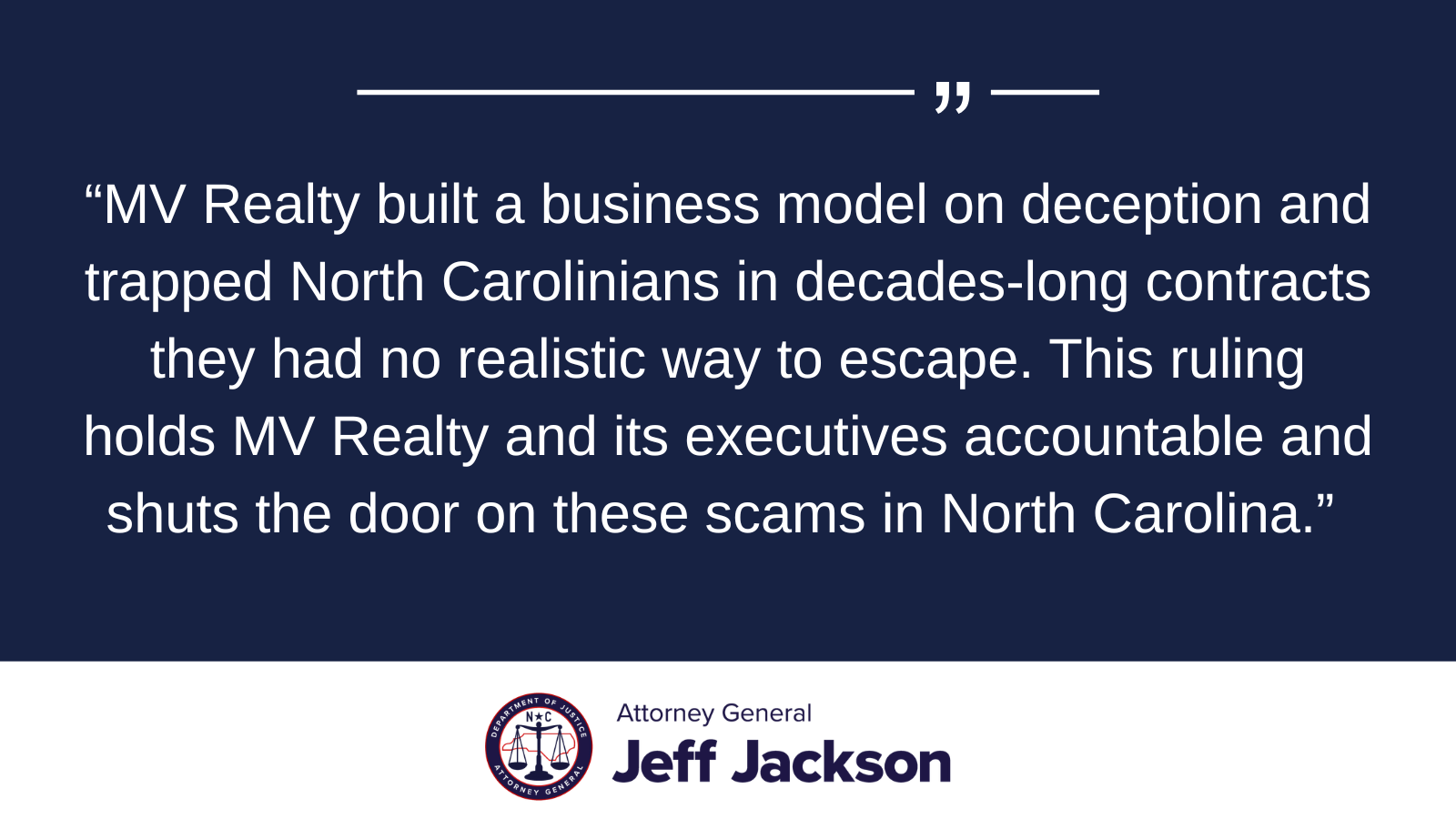 FOR IMMEDIATE RELEASE Thursday, January 22, 2026 Contact: comms@ncdoj.gov RALEIGH – Attorney General Jeff Jackson announced that the North Carolina Department of Justice has won a major victory against MV Realty and its executives. The court granted NCDOJ’s motion for summary judgment, permanently barring MV Realty from enforcing key provisions of its 40-year “Homeowner Benefit […]