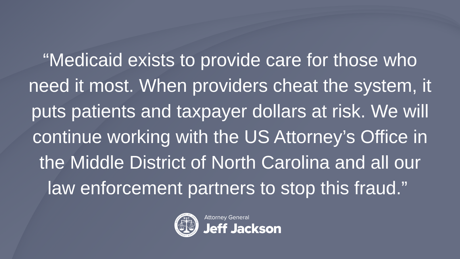 “Medicaid exists to provide care for those who need it most,” said Attorney General Jeff Jackson. “When providers cheat the system, it puts patients and taxpayer dollars at risk. We will continue working with the US Attorney’s Office in the Middle District of North Carolina and all our law enforcement partners to stop this fraud.”
