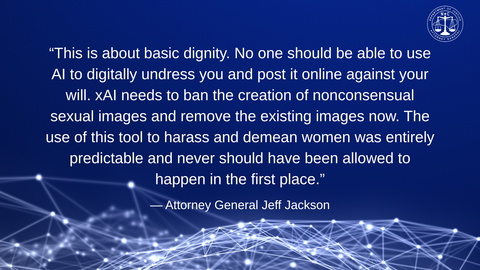 “This is about basic dignity. No one should be able to use AI to digitally undress you and post it online against your will. xAI needs to ban the creation of nonconsensual sexual images and remove the existing images now,” said Attorney General Jeff Jackson“The use of this tool to harass and demean women was entirely predictable and never should have been allowed to happen in the first place.”