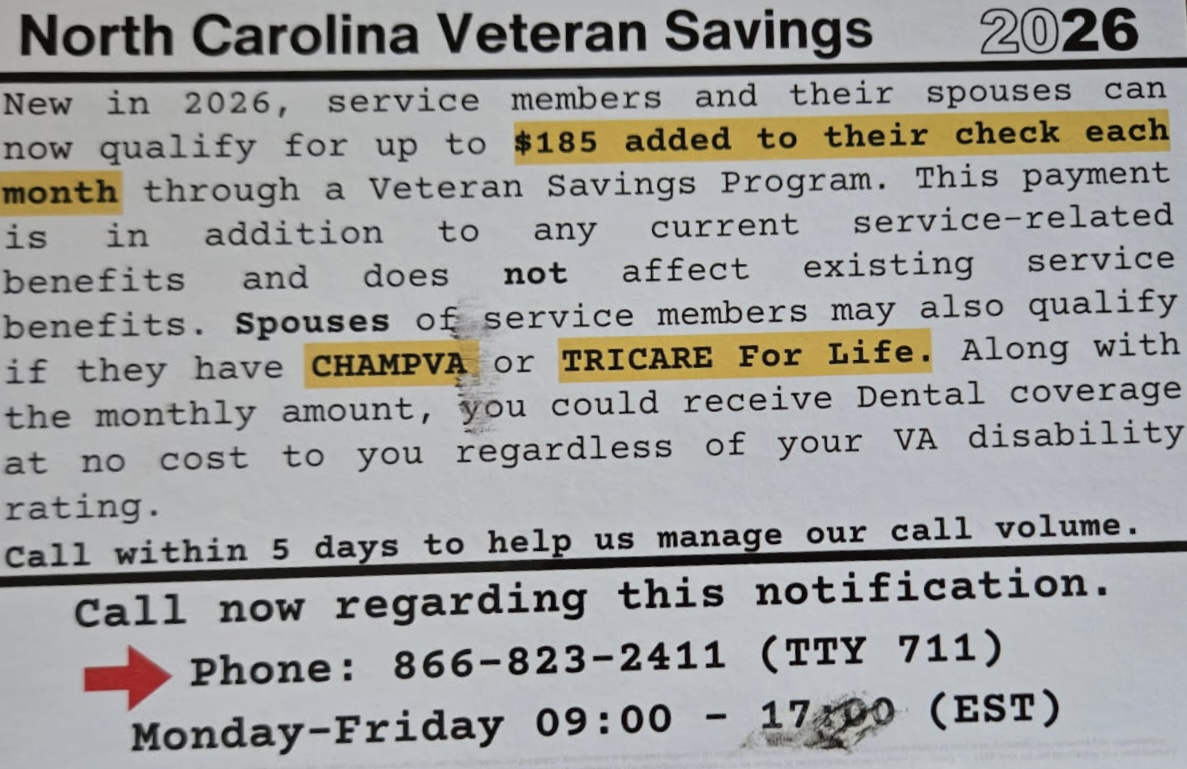 RALEIGH — Attorney General Jeff Jackson is warning veterans across North Carolina about a scam that offers veterans monthly payments and free dental coverage through a Veteran Savings Program. No such program exists. The scam uses high-pressure tactics and urges recipients to “call within five days” for more information. If people call the number listed, scammers will ask for their personal and financial data.