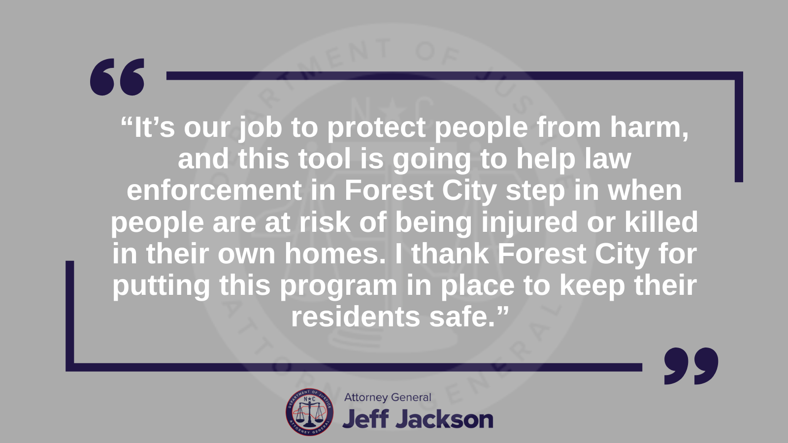 “It’s our job to protect people from harm, and this tool is going to help law enforcement in Forest City step in when people are at risk of being injured or killed in their own homes,” said Attorney General Jeff Jackson. “I thank Forest City for putting this program in place to keep their residents safe.”